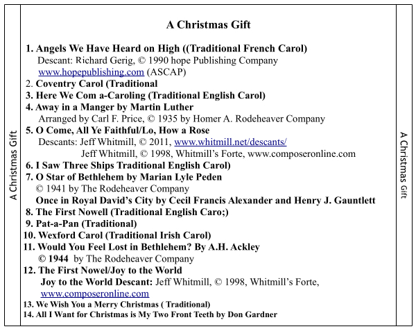 Dr. Belen Palos TuleyMr. Leslie BernhardtWe would like to share this “Christmas gift” with you. Please click on each track to listen and download. Merry Christmas from Belen Palos Tuley and Leslie Bernhardt.Angels We Have Heard On HighCoventry CarolHere We Come A-CarolingAway in a MangerO Come all Ye Faithful/Lo, How a RoseI Saw Three ShipsO Star of Bethlehem/Once in Royal David’s CityThe First NowellPat-a-PanWexford CarolWould You Feel Lost in Bethlehem?The First Nowell/Joy to the WorldWe Wish You a Merry ChristmasAll I Want for Christmas is My Two Front Teeth
